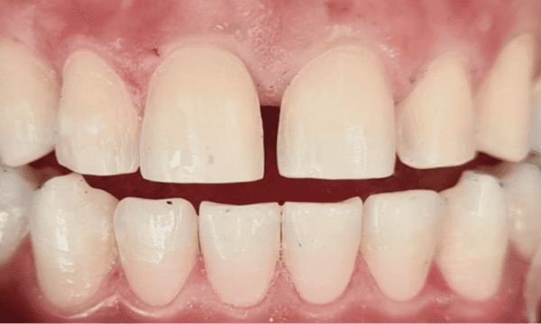 This patient sought to correct the space between their front teeth. We successfully redesigned and restored the patient's upper arch using custom cosmetic restorations. This comprehensive treatment involved ahering veneers to the front surface of the teeth to improve their colour, shape and overall appearance.